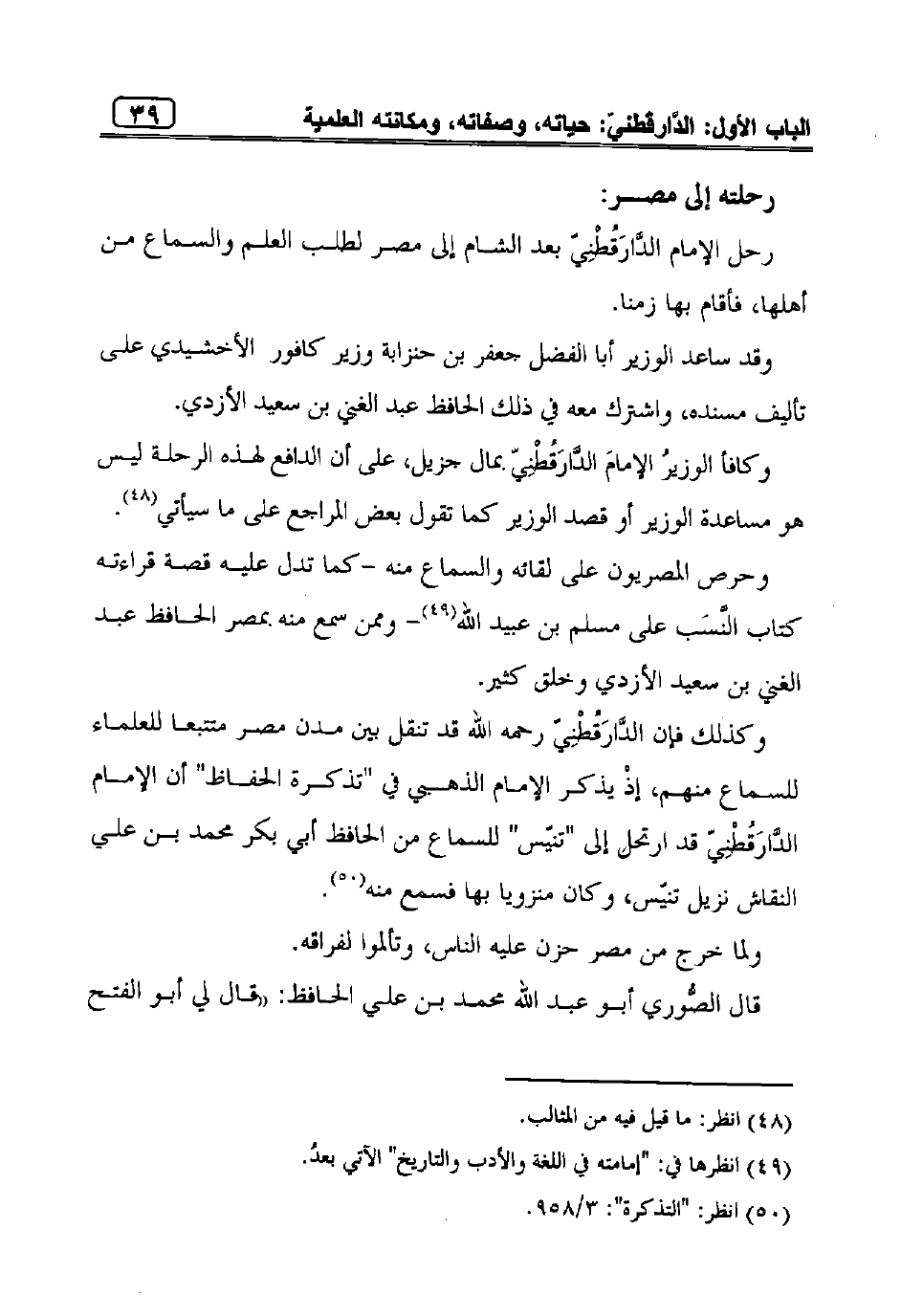 وكذلك فإن الدَّارَقُطْنِيّ رحمه الله قد تنقل بين مدن مصر متتبعا للعلماء للسماع منهم، إذْ يذكر الإمام الذهبي في "تذكرة الحفاظ" أن الإمام الدَّارَقُطْنِيّ قد ارتحل إلى "تنيّس" للسماع من الحافظ أبي بكر محمد بن علي النقاش نزيل تنيّس، وكان منزويا بها فسمع منه"3".