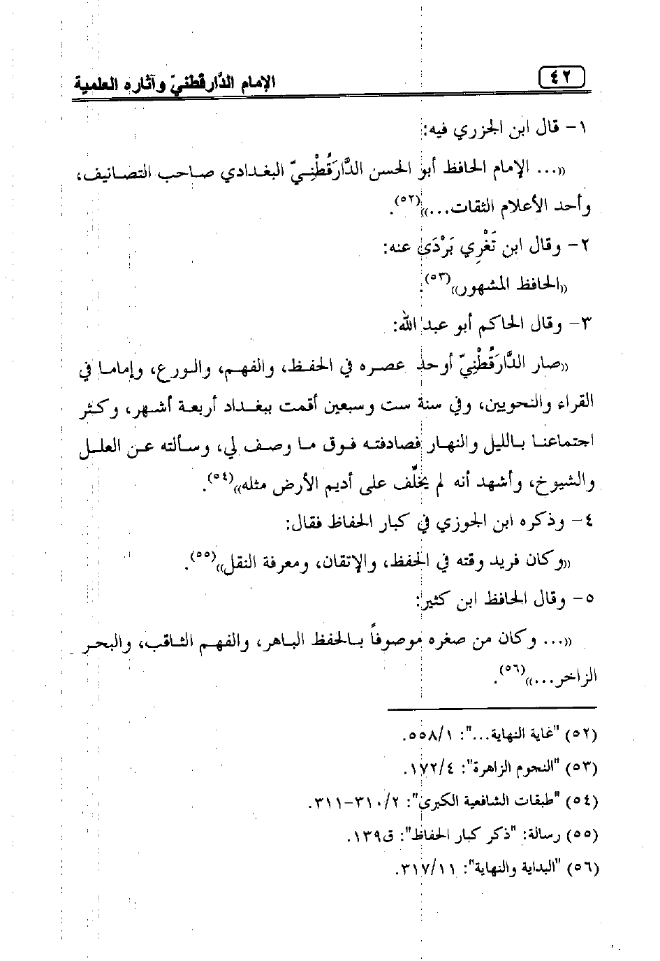 "" ... الإمام الحافظ أبو الحسن الدَّارَقُطْنِيّ البغدادي صاحب التصانيف، وأحد الأعلام الثقات ... """1".