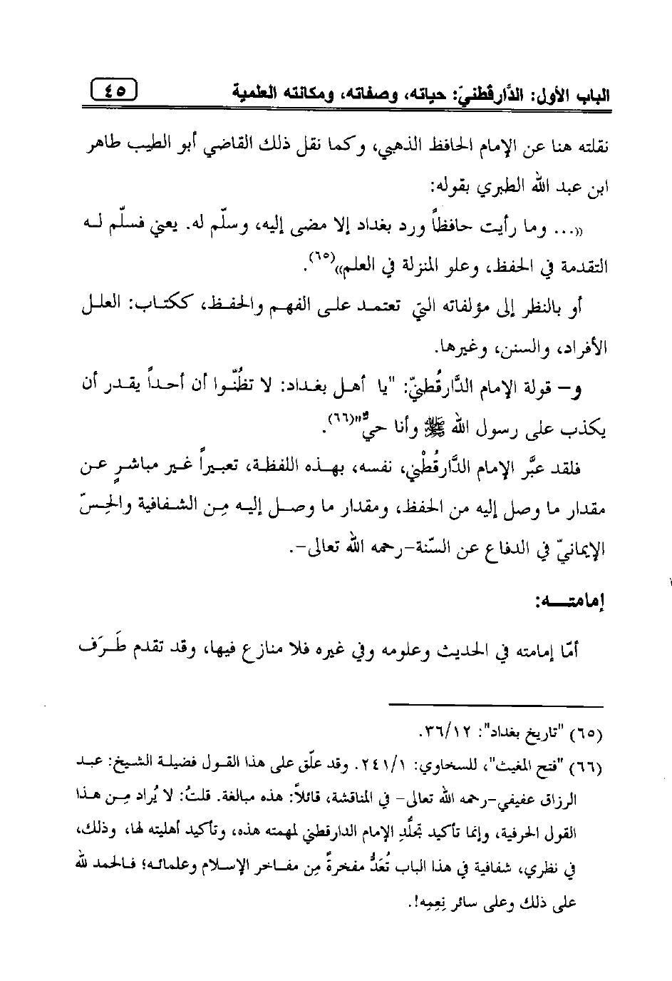 "2" "فتح المغيث"، للسخاوي: 1/241. وقد علّق على هذا القول فضيلة الشيخ: عبد الرزاق عفيفي-رحمه الله تعالى- في المناقشة، قائلاً: هذه مبالغة. قلتُ: لا يُراد مِن هذا القول الحرفية، وإنما تأكيد تجلُّدِ الإمام الدارقطني لمهمته هذه، وتأكيد أهليته لها، وذلك، في نظري، شفافية في هذا الباب تُعَدُّ مفخرةً مِن مفاخر الإسلام وعلمائه؛ فالحمد لله على ذلك وعلى سائر نِعِمِه!.