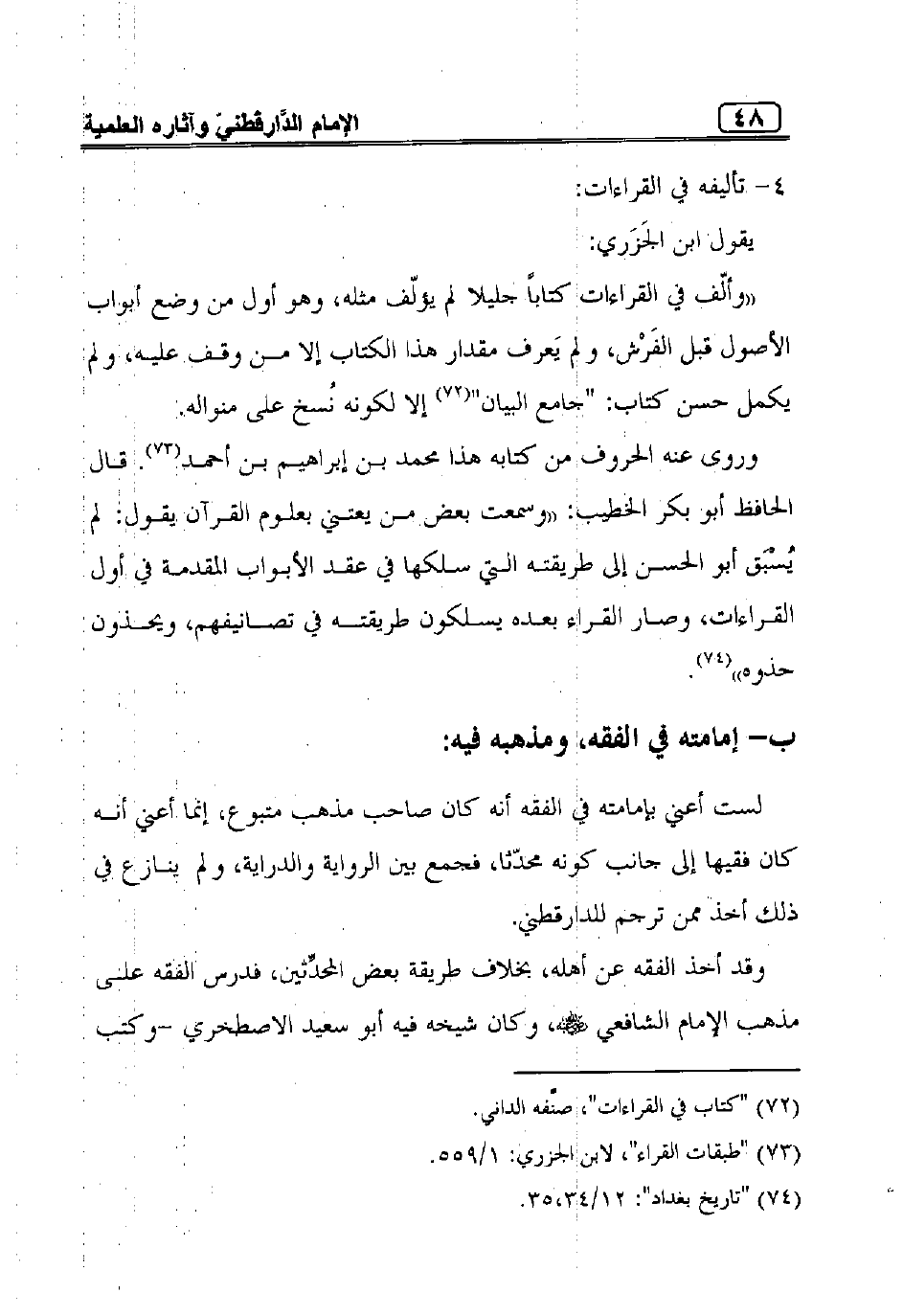 لست أعني بإمامته في الفقه أنه كان صاحب مذهب متبوع، إنما أعني أنه كان فقيها إلى جانب كونه محدّثا، فجمع بين الرواية والدراية، ولم ينازع في ذلك أخذ ممن ترجم للدارقطني.