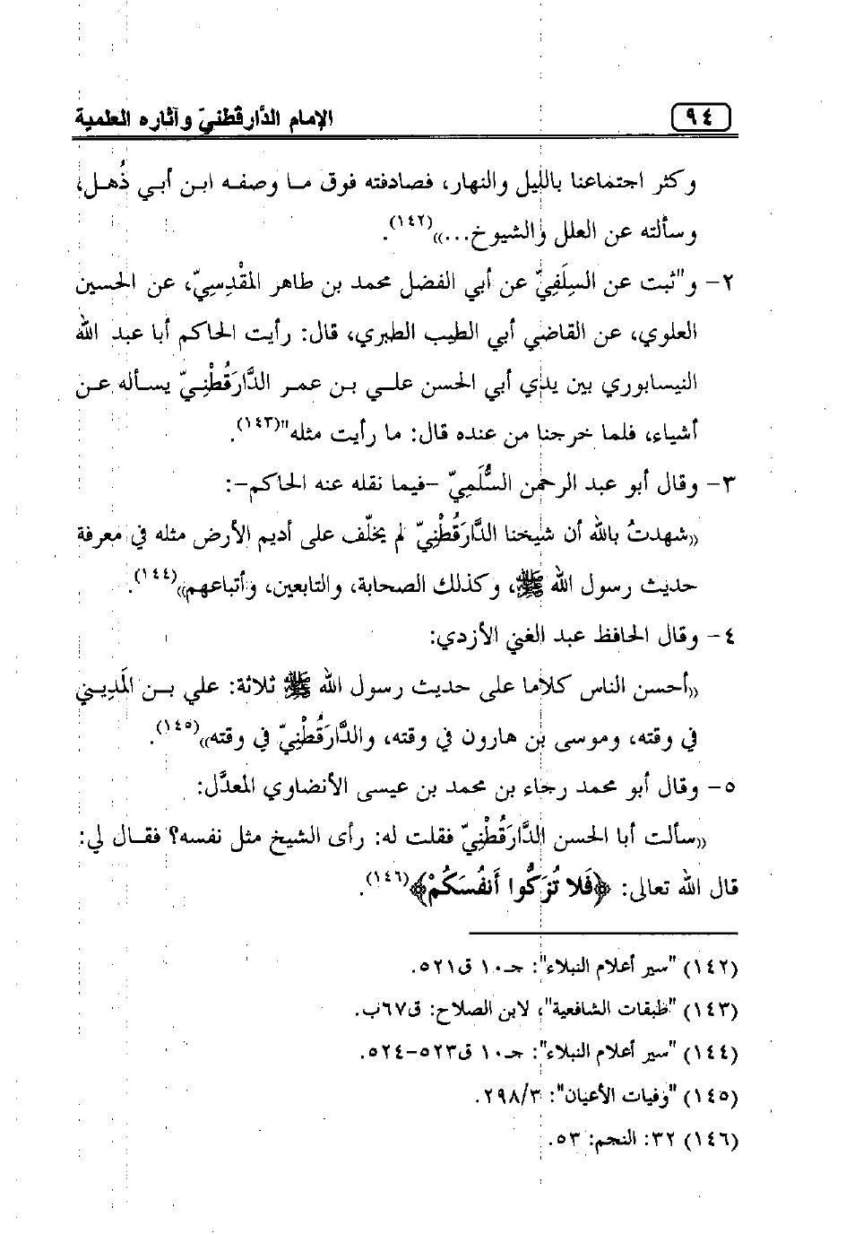 ""سألت أبا الحسن الدَّارَقُطْنِيّ فقلت له: رأى الشيخ مثل نفسه؟ فقال لي: قال الله تعالى: {فَلا تُزَكُّوا أَنفُسَكُمْ} "5".