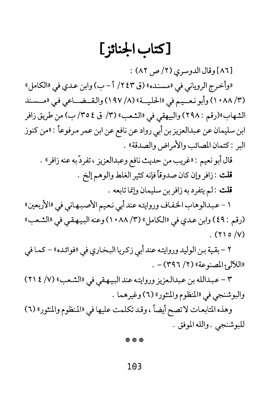 "وأخرج الروياني في "مسنده" (ق 243/ أ-ب) وابن عدي في "الكامل" (3/ 1088) وأبو نعيم في "الحلية" (8/ 197) والقضاعي في "مسند الشهاب" (رقم: 298) والبيهقي في "الشعب" من طريق زافر ابن سليمان عن عبد العزيز بن أبي رواد عن نافع عن ابن عمر مرفوعًا: "من كنوز البر: كتمان المصائب والأمراض والصدقة".