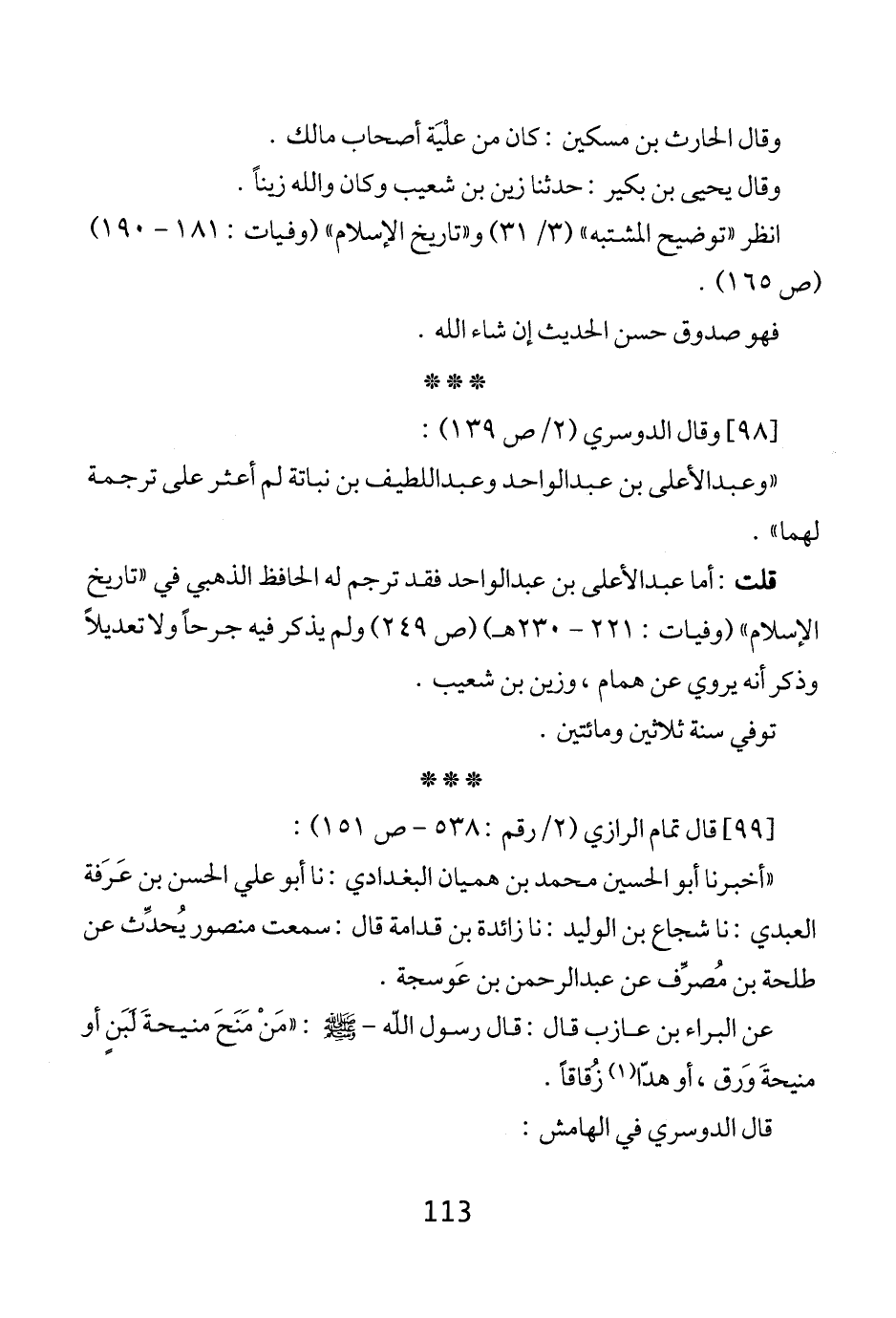"أخبرنا أبو الحسن محمد بن هميان البغدادي: نا أبو علي الحسن بن عَرَفة العبدي: نا شجاع بن الوليد: نا زائدة بن قدامة قال: سمعت منصور يُحدِّث عن طلحة بن مُصرِّف عن عبد الرحمن بن عَوسجة.
