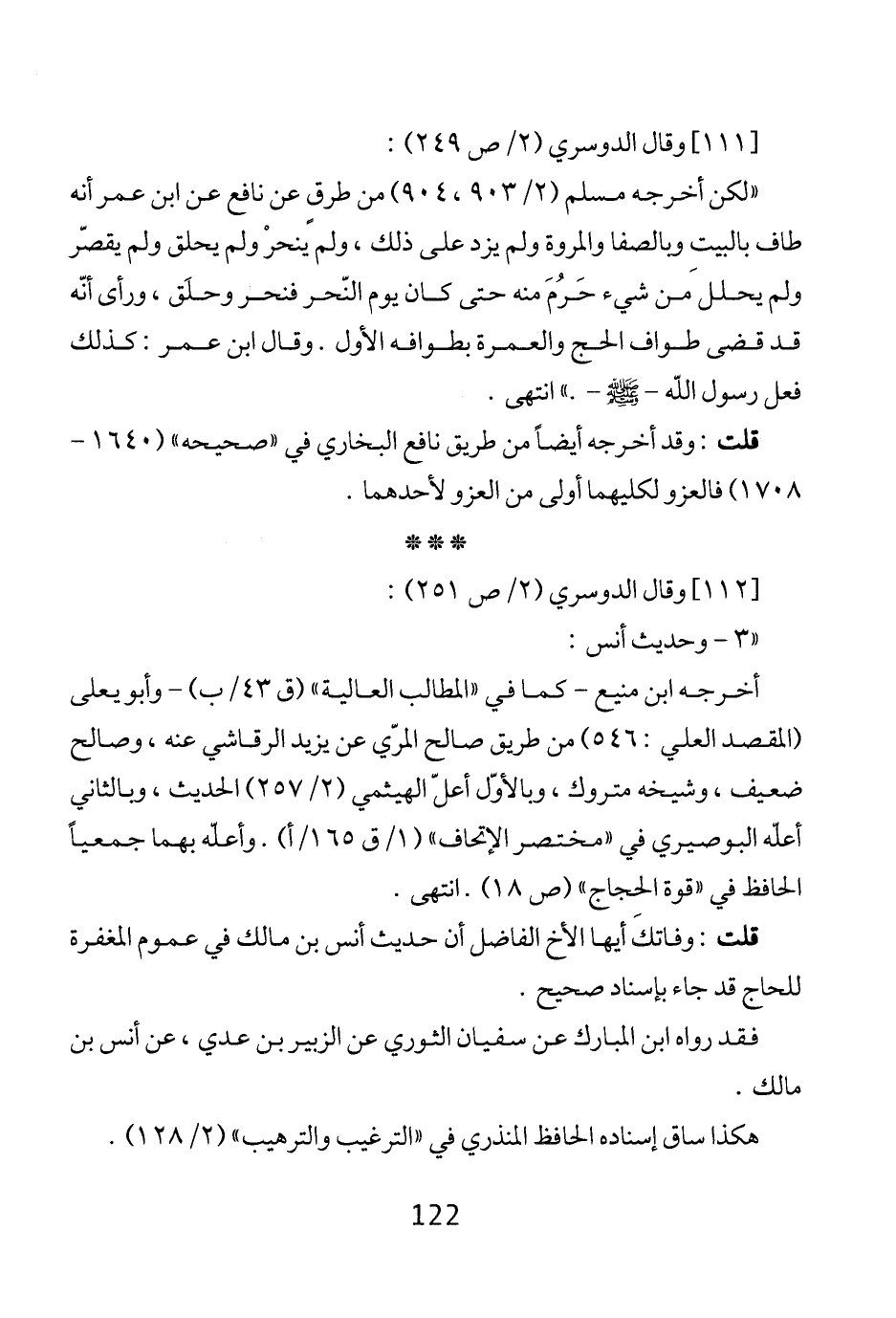 "لكن أخرجه مسلم (2/ 903، 904) من طرقٍ عن نافع عن ابن عمر أنه طاف بالبيتِ وبالصفا والمروة ولم يزد على ذلك، ولم ينحرْ ولم يحلق ولم يقصّر ولم يحلل من شيء حَرُمَ منه حتى كان يوم النّحر فنحر وحلَق، ورأى أنّه قد قضى طواف الحج والعمرة بطوافه الأول. وقال ابن عمر: كذلك فعل رسول الله - صلى الله عليه وسلم -." انتهى.