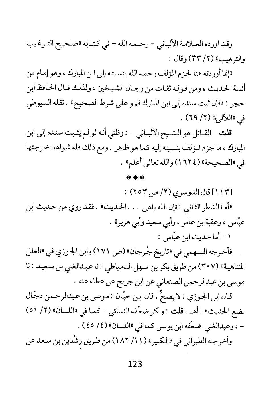 قلت -القائل هو الشيخ الألباني-: وظني أنه لو لم يثبت سنده إلى ابن المبارك، ما جزم المؤلف بنسبته إليه كما هو ظاهر. ومع ذلك فله شواهد خرجتها في "الصحيحة" (1624) والله تعالى أعلم".