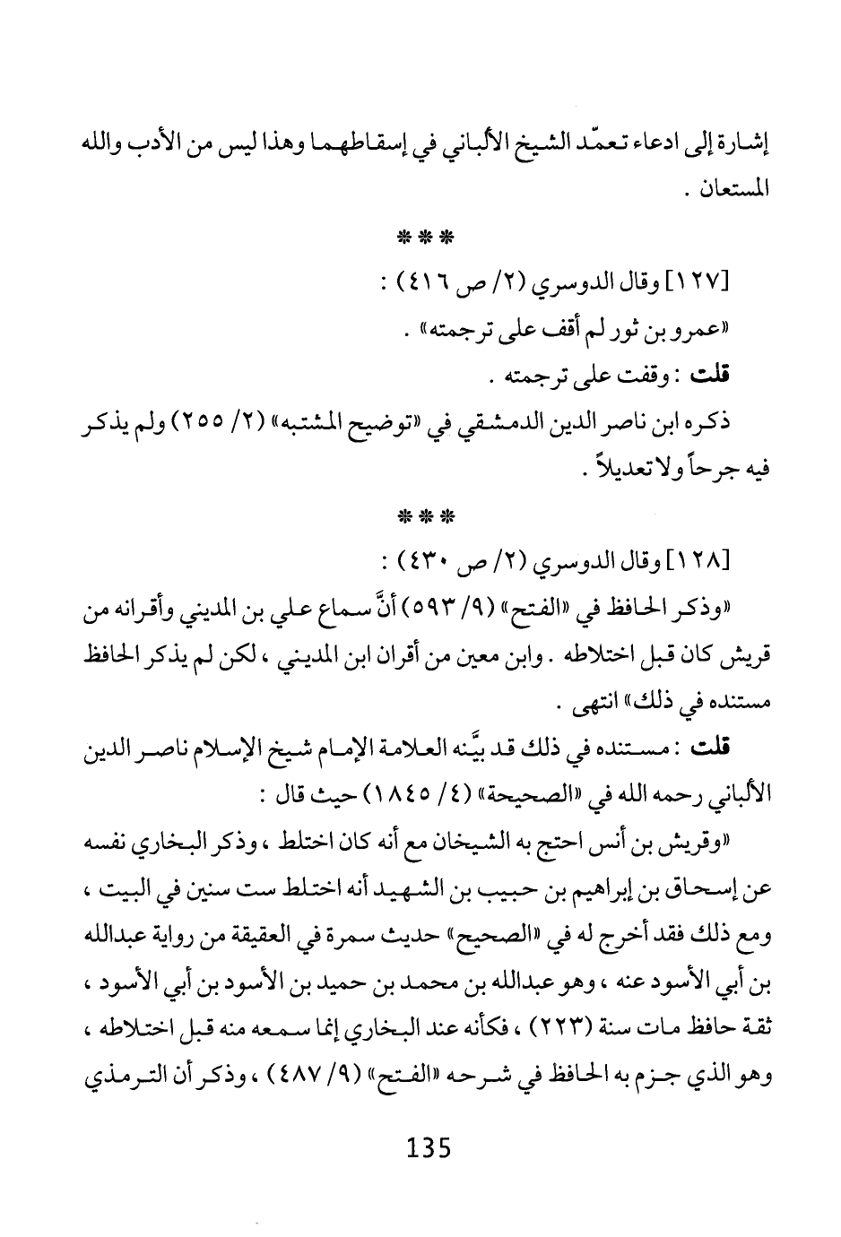 "وقريش بن أنس احتج به الشيخان مع أنه كان اختلط، وذكر البخاري نفسه عن إسحاق بن إبراهيم بن حبيب بن الشهيد أنه اختلط ست سنين في البيت، ومع ذلك فقد أخرج له في "الصحيح" حديث سمرة في العقيقة من رواية عبد الله بن أبي الأسود عنه، وهو عبد الله بن محمد بن حميد بن الأسود بن أبي الأسود، ثقة حافظ مات سنة (223)، فكأنه عند البخاري إنما سمعه منه قبل اختلاطه، وهو الذي جزم به الحافظ في شرحه "الفتح" (9/ 487)، وذكر أن الترمذي