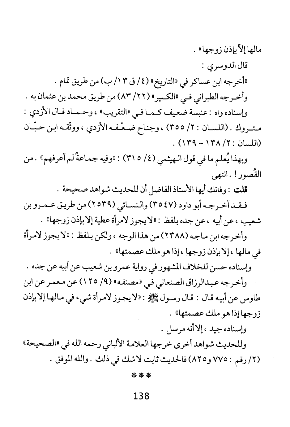 وأخرجه ابن ماجه (2388) من هذا الوجه، ولكن بلفظ: "لا يجوز لامرأة فى مالها، إلا بإذن زوجها، إذا هو ملك عصمتها".