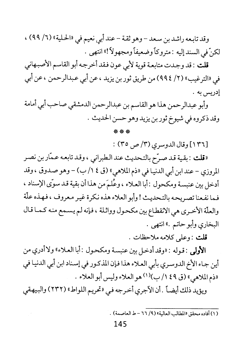 الأولى: قوله: "وقد أدخل بين عنبسة ومكحول: أبا العلاء" ولا أدري من أين جاء الأخ الدوسري بأبي العلاء هذا فإن المذكور في إسناد ابن أبي الدنيا في "ذم الملاهي" (ق 149/ ب) (¬1) هو العلاء وليس أبو العلاء.