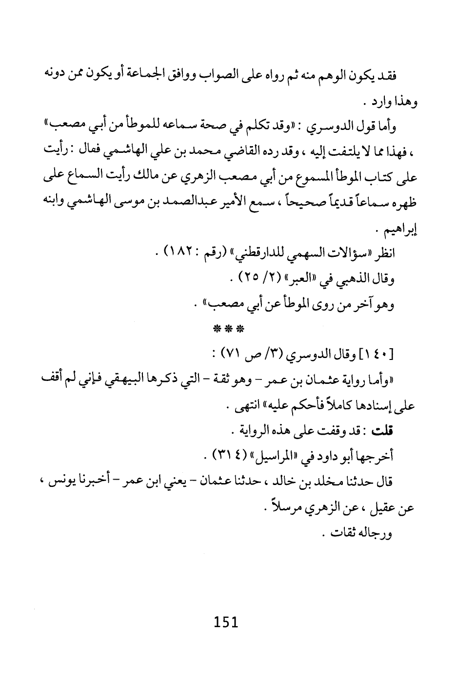 وأما قول الدوسري: "وقد تكلم في صحة سماعه للموطأ من أبي مصعب"، فهذا مما لايلتفت إليه، وقد رده القاضي محمد بن علي الهاشمي فقال: رأيت على كتاب الموطأ المسموع من أبي مصعب الزهري عن مالك رأيت السماع على ظهره سماعًا قديمًا صحيحًا، سمع الأمير عبد الصمد بن موسى الهاشمي وابنه إبراهيم.