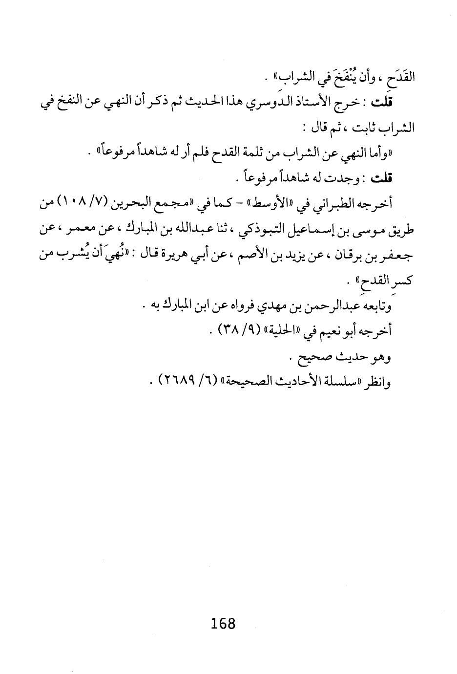 قلت: خرج الأستاذ الدوسري هذا الحديث ثم ذكر أن النهي عن النفخ في الشراب ثابت، ثم قال: