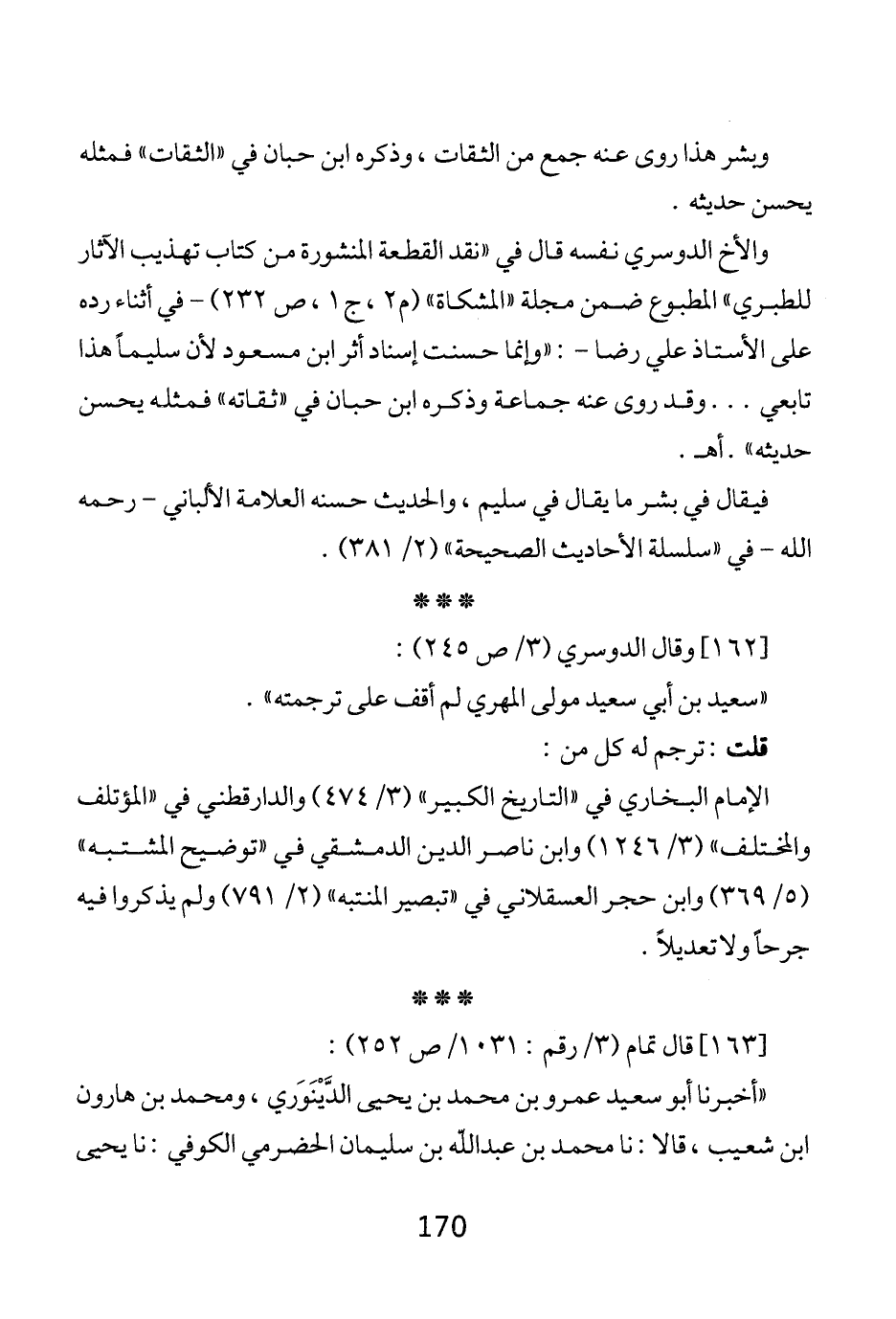 والأخ الدوسري نفسه قال في "نقد القطعة المنشورة من كتاب تهذيب الآثار للطبري" المطبوع ضمن مجلة "المشكاة" (م 2، ج 1، ص 232) -في أثناء رده على الأستاذ علي رضا-: "وإنما حسنت إسناد أثر ابن مسعود لأن سليمًا هذا تابعي. . .وقد روى عنه جماعة وذكره ابن حبان في "ثقاته" فمثله يحسن حديثه". أهـ.
