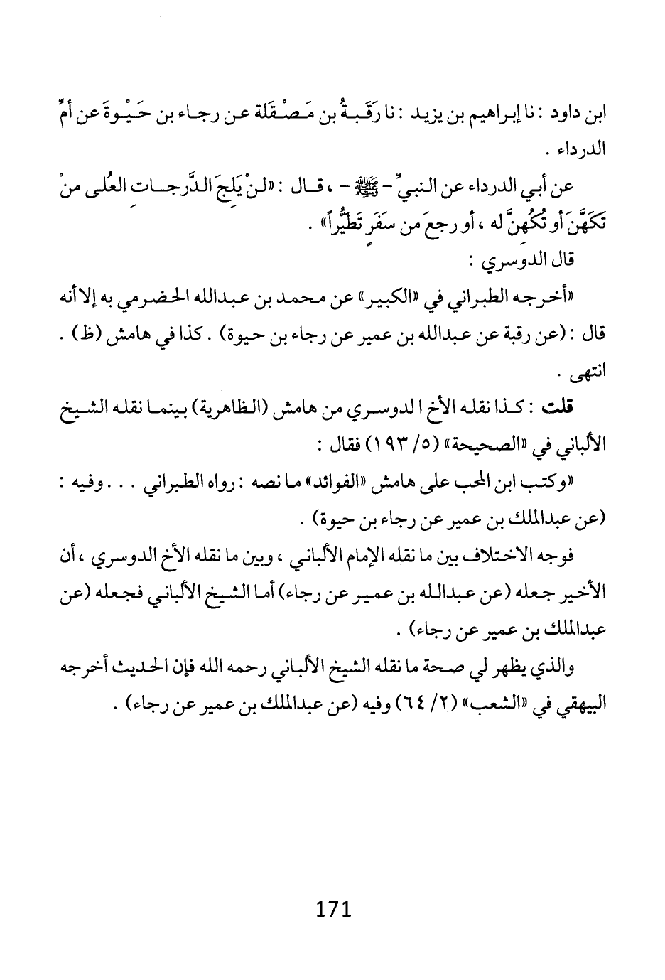 فوجه الاختلاف بين ما نقله الإمام الألباني، وبين ما نقله الأخ الدوسري، أن الأخير جعله (عن عبد الله بن عمير عن رجاء) أما الشيخ الألباني فجعله (عن عبد الملك بن عمير عن رجاء).