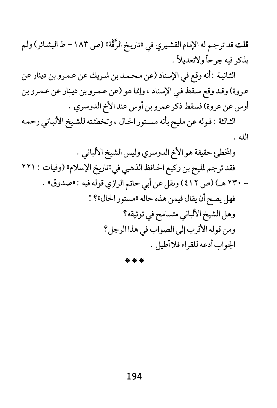 الثالثة: قوله عن مليح بأنه مستور الحال، وتخطئته للشيخ الألباني رحمه الله.