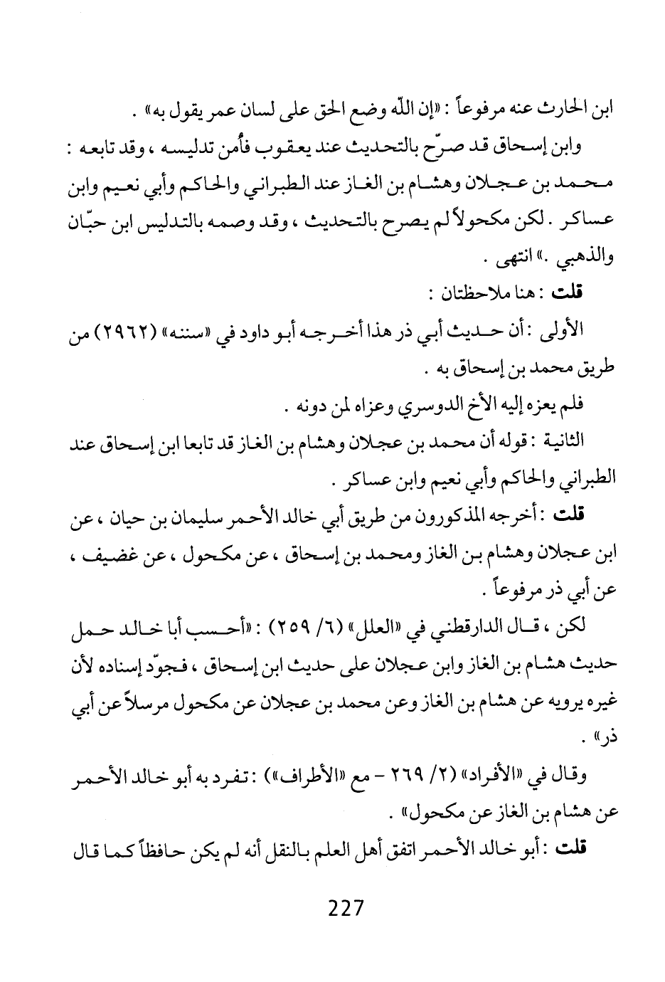لكن، قال الدارقطني في "العلل" (6/ 259): "أحسب أبا خالد حمل حديث هشام بن الغاز وابن عجلان على حديث ابن إسحاق، فجوّد إسناده لأن غيره يرويه عن هشام بن الغاز وعن محمد بن عجلان عن مكحول مرسلًا عن أبي ذر".