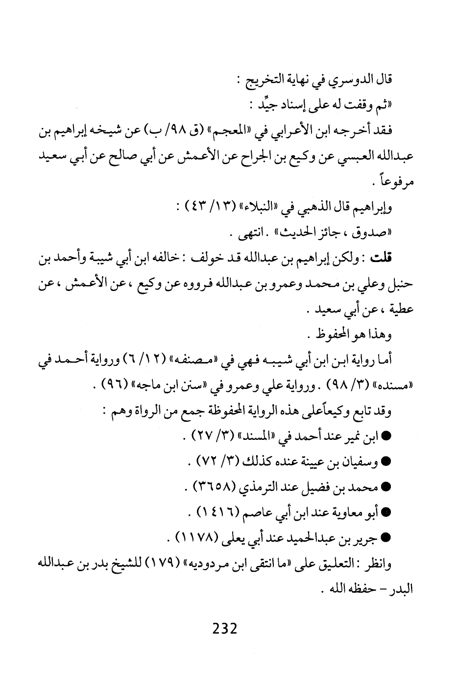 قلت: ولكن إبراهيم بن عبد الله قد خولف: خالفه ابن أبي شيبة وأحمد بن حنبل وعلي بن محمد وعمرو بن عبد الله فرووه عن وكيع، عن الأعمش، عن عطية، عن أبي سعيد.
