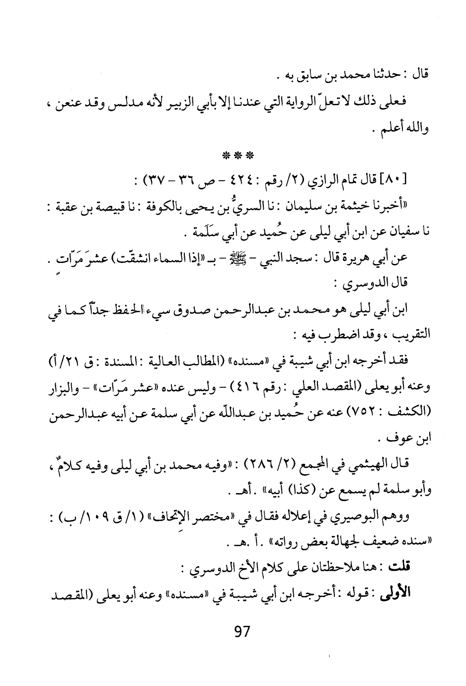 "أخبرنا خيثمة بن سليمان: نا السريُّ بن يحيى بالكوفة: نا قبيصة بن عقبة: نا سفيان عن ابن أبي ليلى عن حُميد عن أبي سَلَمة.
