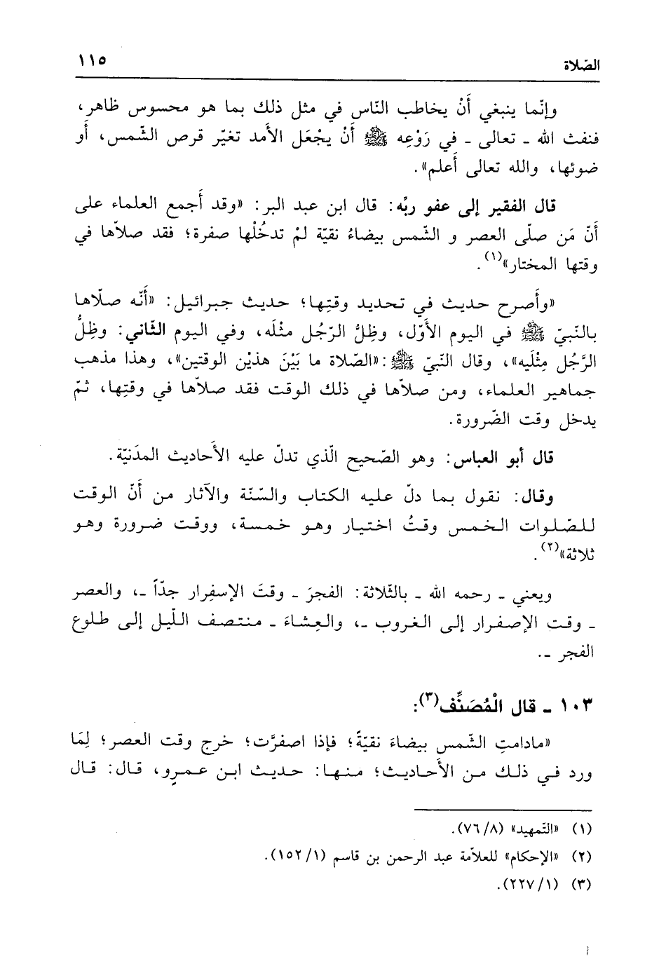 قال الفقير إلى عفو ربه: قال ابن عبد البر: "وقد أَجمع العلماء على أَنّ مَن صلى العصر والشمس بيضاءُ نقية لمْ تدخُلْها صفرة؛ فقد صلاها في وقتها المختار" (¬1).