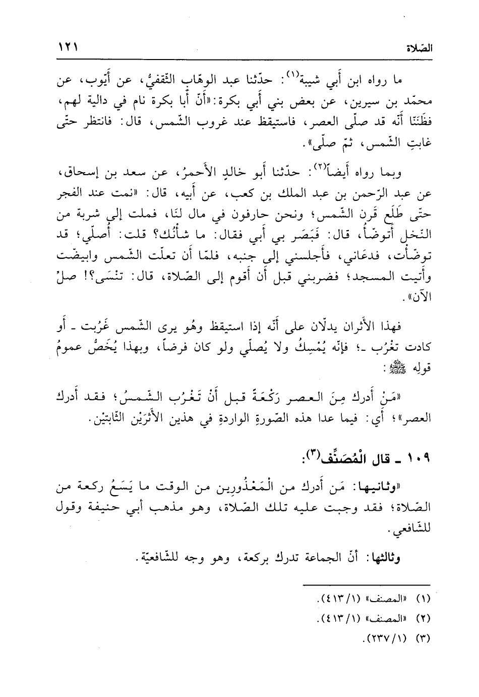 وبما رواه أَيضًا (¬2): حدثنا أَبو خالدِ الأَحمرُ، عن سعد بن إسحاق، عن عبد الرحمن بن عبد الملك بن كعب، عن أَبيه، قال: "نمت عند الفجر حتّى طَلَع قَرن الشمس؛ ونحن حارفون في مال لنَا، فملت إلى شربة من النخل أتوضّأُ، قال: فَبَصَر بي أَبي فقال: ما شأْنُك؟ قلت. أُصلي؛ قد توضأت، فدعَاني، فأَجلسني إلى جنبه، فلمَّا أَن تعلت الشمس وابيضت وأَتيت المسجد؛ فضربني قبل أَن أَقوم إلى الصلاة، قال: تنْسَى؟! صل الآن".