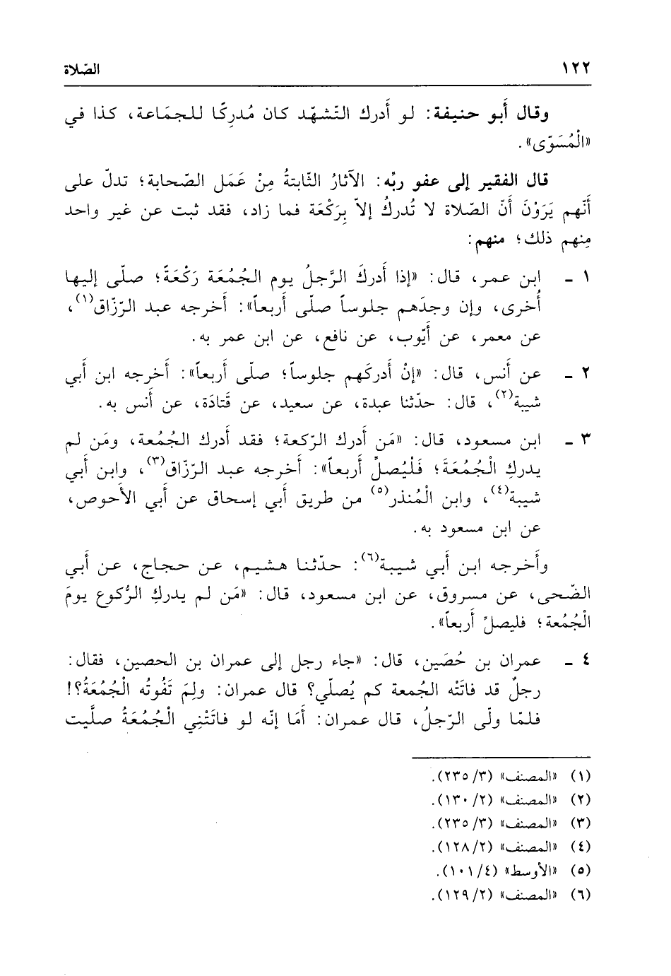 3 - ابن مسعود، قال: "مَن أَدرك الركعة؛ فقد أَدرك الجُمُعة، ومَن لم يدركِ الْجُمُعَةَ؛ فَلْيُصل أَربعًا": أَخرجه عبد الرزاق (¬3)، وابن أَبي شيبة (¬4)، وابن الْمُنذر (¬5) من طريق أَبي إسحاق عن أَبي الأَحوص، عن ابن مسعود به.