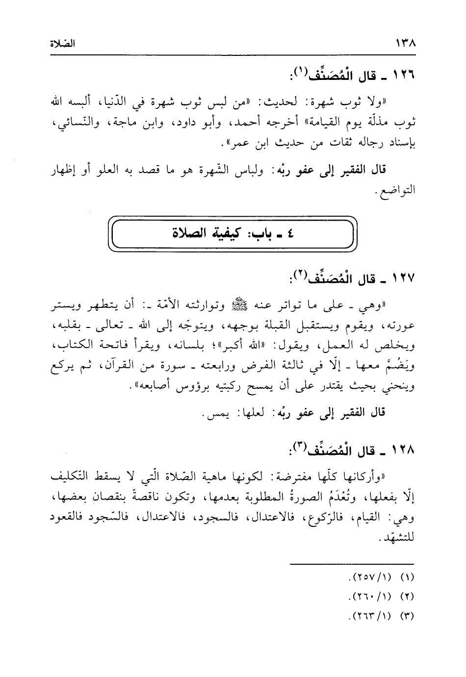 "وهي -على ما تواتر عنه - صلى الله عليه وسلم - وتوارثته الأمّة-: أن يتطهر ويستر عورته، ويقوم ويستقبل القبلة بوجهه، ويتوجه إلى الله -تعالى- بقلبه، ويخلص له العمل، ويقول: "الله أكبر"؛ بلسانه، ويقرأ فاتحة الكتاب، ويَضُمَّ معها -إلّا في ثالثة الفرض ورابعته- سورة من القرآن، ثم يركع وينحني بحيث يقتدر على أن يمسح ركبتيه برؤوس أصابعه".