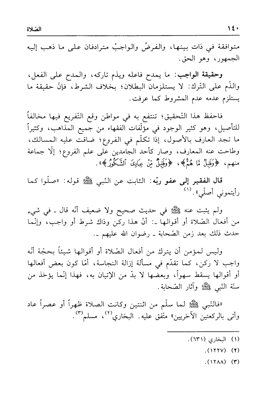 وليس لمؤمن أن يترك من أفعال الصلاة أو أقوالها شيئًا بحجة أنه واجب لا ركن، كما تقدم في مسألة إزالة النجاسة، أما كون بعض أفعالها أو أقوالها يسقط سهوًا، وبعضها لا بد من الإتيان به، فهذا إنَّما يؤخذ من سنة النبي - صلى الله عليه وسلم - وآثار الصحابة.