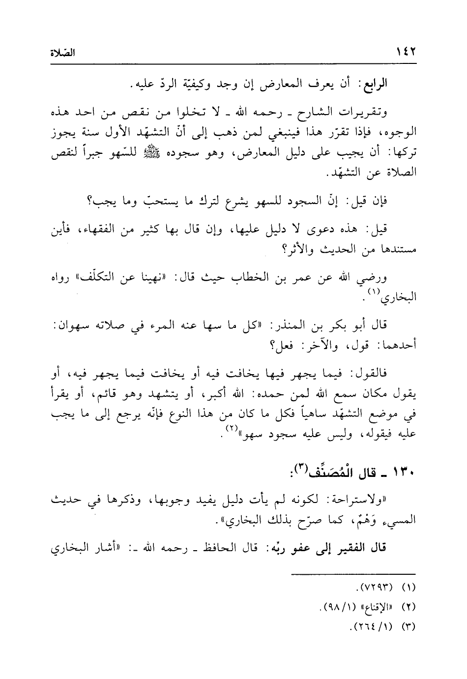 وتقريرات الشارح -رحمه الله- لا تخلوا من نقص من أحد هذه الوجوه، فإذا تقرر هذا فينبغي لمن ذهب إلى أن التشهد الأول سنة يجوز تركها: أن يجيب على دليل المعارض، وهو سجوده - صلى الله عليه وسلم - للسّهو جبرًا لنقص الصلاة عن التشهد.
