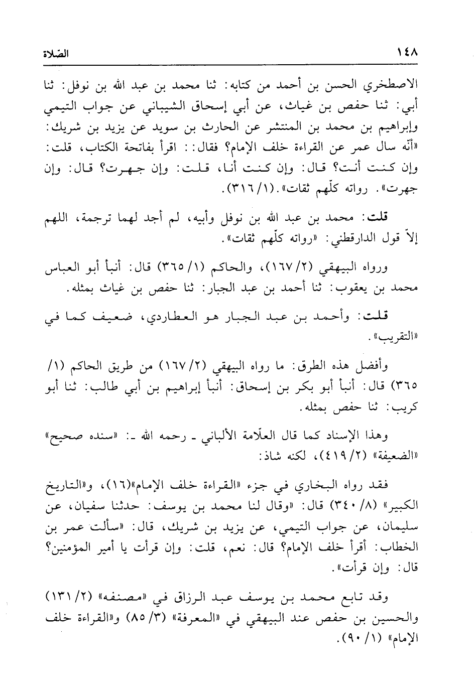 الإصطخري الحسن بن أحمد من كتابه: ثنا محمد بن عبد الله بن نوفل: ثنا أبي: ثنا حفص بن غياث، عن أبي إسحاق الشيباني عن جواب التيمي وإبراهيم بن محمد بن المنتشر عن الحارث بن سويد عن يزيد بن شريك: "أنّه سأل عمر عن القراءة خلف الإمام؟ فقال: اقرأ بفاتحة الكتاب، قلت: وإن كنت أنت؟ قال: وإن كنت أنا، قلت: وإن جهرت؟ قال: وإن جهرت". رواته كلّهم ثقات". (1/ 316).