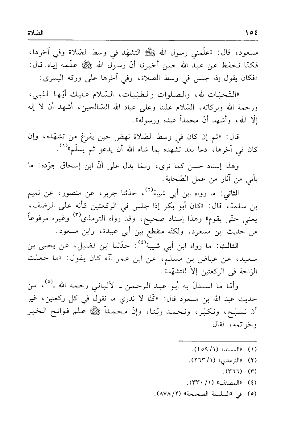 مسعود، قال: "علمني رسول الله - صلى الله عليه وسلم - التشهد في وسط الصلاة وفي آخرها، فكنا نحفظ عن عبد الله حين أخبرنا أن رسول الله - صلى الله عليه وسلم - علمه إياه. قال: "فكان يقول إذا جلس في وسط الصلاة، وفي آخرها على وركه اليسرى: