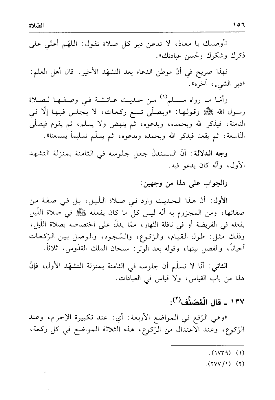 وأما ما رواه مسلم (¬1) من حديث عائشة في وصفها لصلاة رسول الله - صلى الله عليه وسلم - وقولها: "ويصلى تسع ركعات، لا يجلس فيها إلا في الثامنة، فيذكر الله ويحمده، ويدعوه، ثم ينهض ولا يسلم، ثم يقوم فيصلى التاسعة، ثم يقعد فيذكر الله ويحمده ويدعوه، ثم يسلم تسليمًا يسمعنا".