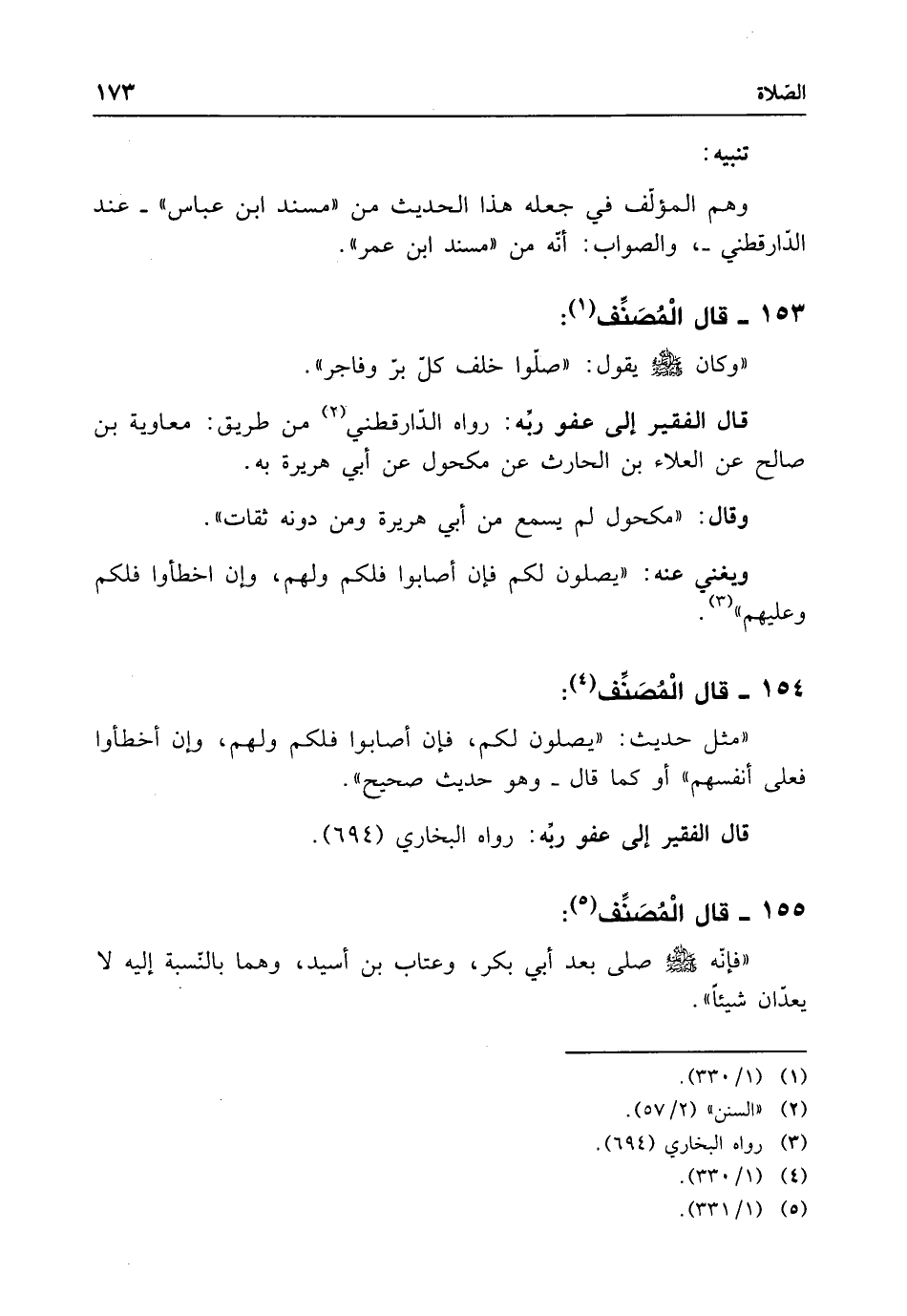 "مثل حديث: "يصلون لكم، فإن أصابوا فلكم ولهم، وإن أخطأوا فعلى أنفسهم" أو كما قال -وهو حديث صحيح".
