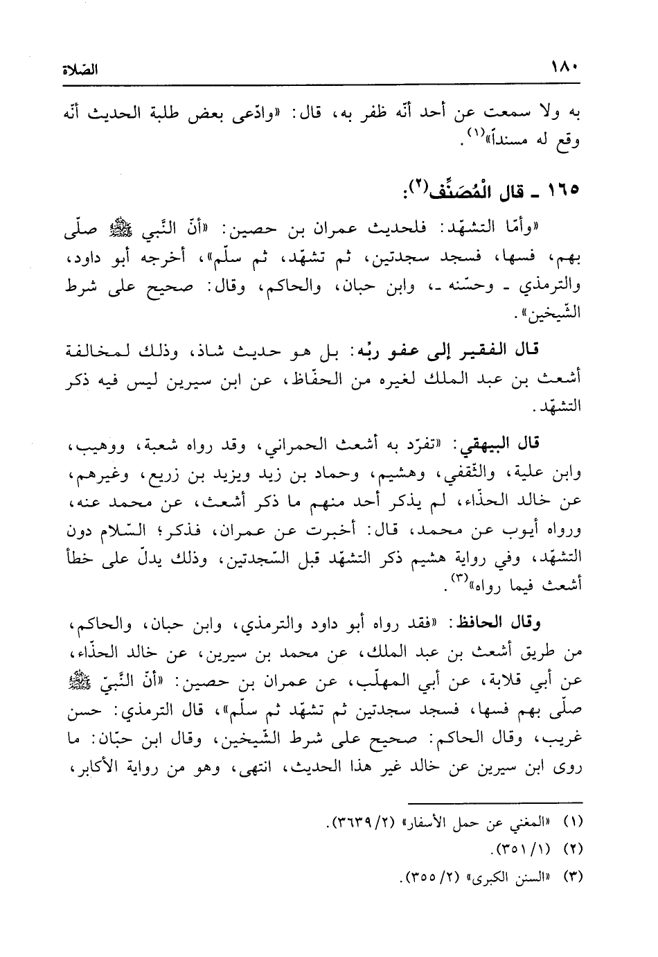 قال البيهقي: "تفرد به أشعث الحمراني، وقد رواه شعبة، ووهيب، وابن علية، والثقفي، وهشيم، وحماد بن زيد ويزيد بن زريع، وغيرهم، عن خالد الحذاء، لم يذكر أحد منهم ما ذكر أشعث، عن محمد عنه، ورواه أيوب عن محمد، قال: أخبرت عن عمران، فذكر؛ السلام دون التشهد، وفي رواية هشيم ذكر التشهد قبل السجدتين، وذلك يدل على خطأ أشعث فيما رواه" (¬3).