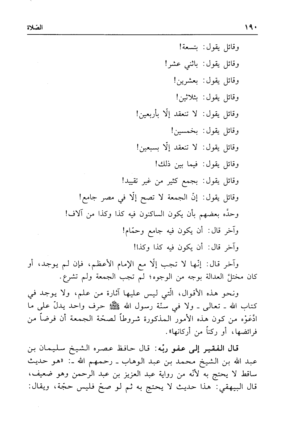 ونحو هذه الأقوال، التي ليس عليها آثارة من علم، ولا يوجد في كتاب الله -تعالى- ولا في سنة رسول الله - صلى الله عليه وسلم - حرف واحد يدل على ما ادَّعَوْه من كون هذه الأمور المذكورة شروطًا لصحة الجمعة أنْ فرضًا من فرائضها، أو ركنًا من أركانها".