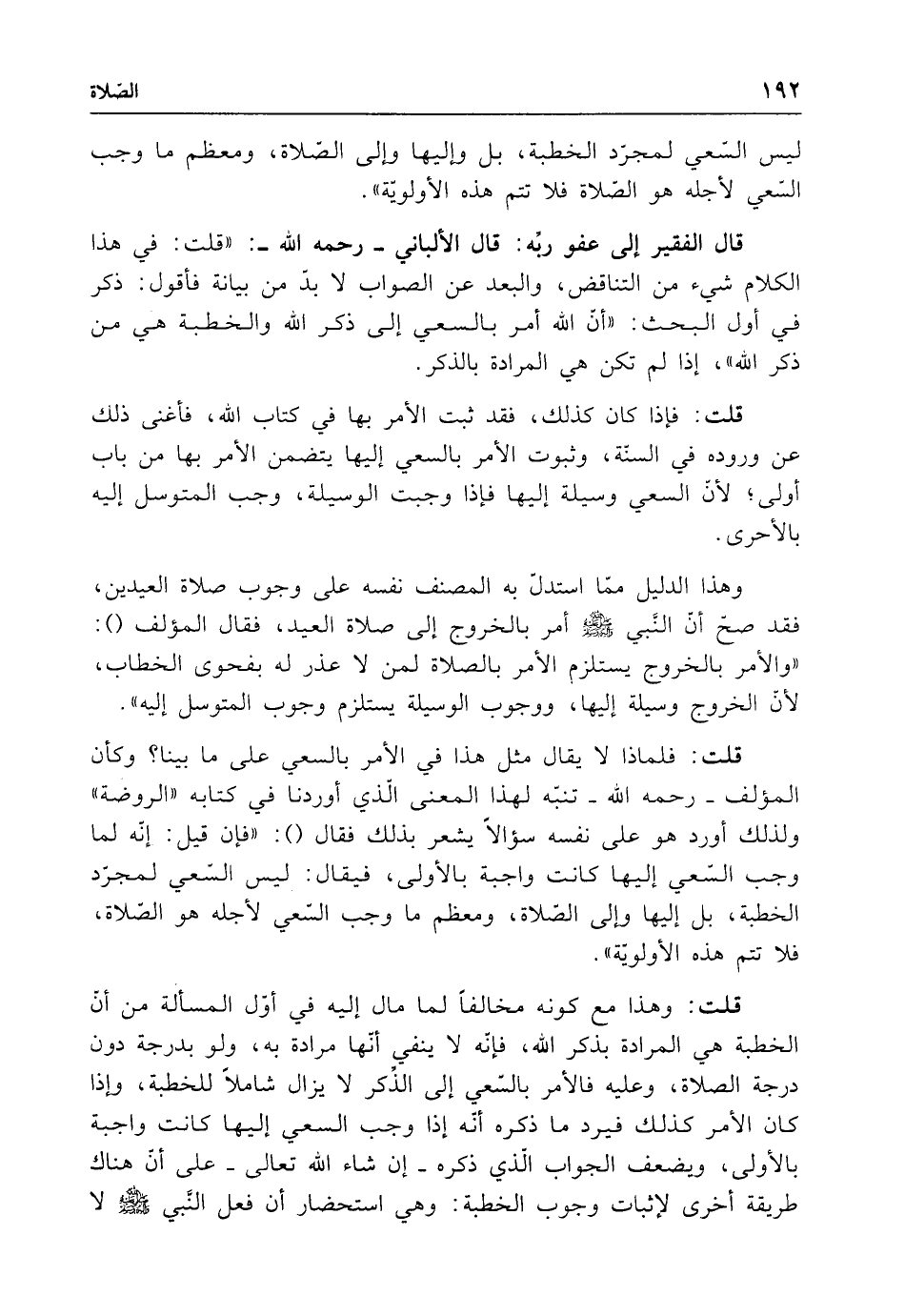 قلت: فلماذا لا يقال مثل هذا في الأمر بالسعي على ما بينا؛ وكأن المؤلف -رحمه الله- تنبه لهذا المعنى الذي أوردنا في كتابه "الروضة" ولذلك أورد هو على نفسه سؤالًا يشعر بذلك فقال (): "فإن قيل: إنه لما وجب السعي إليها كانت واجبة بالأولى، فيقال: ليس السّعي لمجرد الخطبة، بل إليها وإلى الصلاة، ومعظم ما وجب السعي لأجله هو الصلاة، فلا تتم هذه الأولوية".