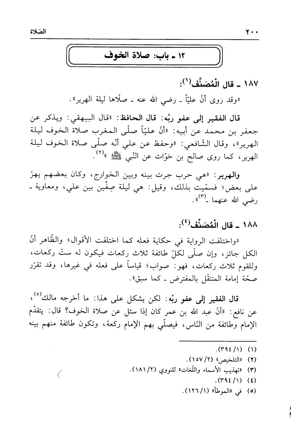 قال الفقير إلى عفو ربه: قال الحافظ: "قال البيهقي: ويذكر عن جعفر بن محمد عن أبيه: "أن عليًّا صلى المغرب صلاة الخوف ليلة الهرير"، وقال الشافعي: "وحفظ عن علي أنّه صلى صلاة الخوف ليلة الهرير، كما روى صالح بن خوات عن النبي - صلى الله عليه وسلم -" (¬2).