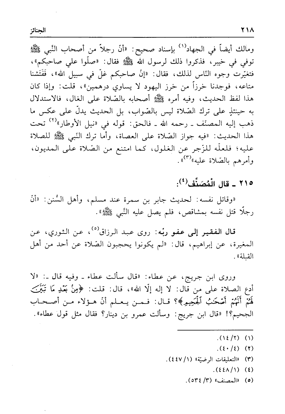 ومالك أيضًا في الجهاد (¬1) بإسناد صحيح: "أن رجلًا من أصحاب النبي - صلى الله عليه وسلم - توفي في خيبر، فذكروا ذلك لرسول الله - صلى الله عليه وسلم - فقال: "صلوا علي صاحبكم"، فتغيرت وجوه الناس لذلك، فقال: "إن صاحبكم غل في سبيل الله"، فَفَتَشنا متاعه، فوجدنا خرزًا من خرز اليهود لا يساوي درهمين"، قلت: وإذا كان هذا لفظ الحديث، وفيه أمره - صلى الله عليه وسلم - أصحابه بالصلاة على الغال , فالاستدلال به حينئذٍ على ترك الصلاة ليس بالصواب، بل الحديث يدل على عكس ما ذهب إليه المصنف -رحمه الله- فالحق: قوله في "نيل الأوطار" (¬2) تحت هذا الحديث: "فيه جواز الصلاة على العصاة، وأما ترك النبي - صلى الله عليه وسلم - للصلاة عليه؛ فلعلّه للزجر عن الغلول، كما امتنع من الصلاة على المديون، وأمرهم بالصلاة عليه" (¬3) ".