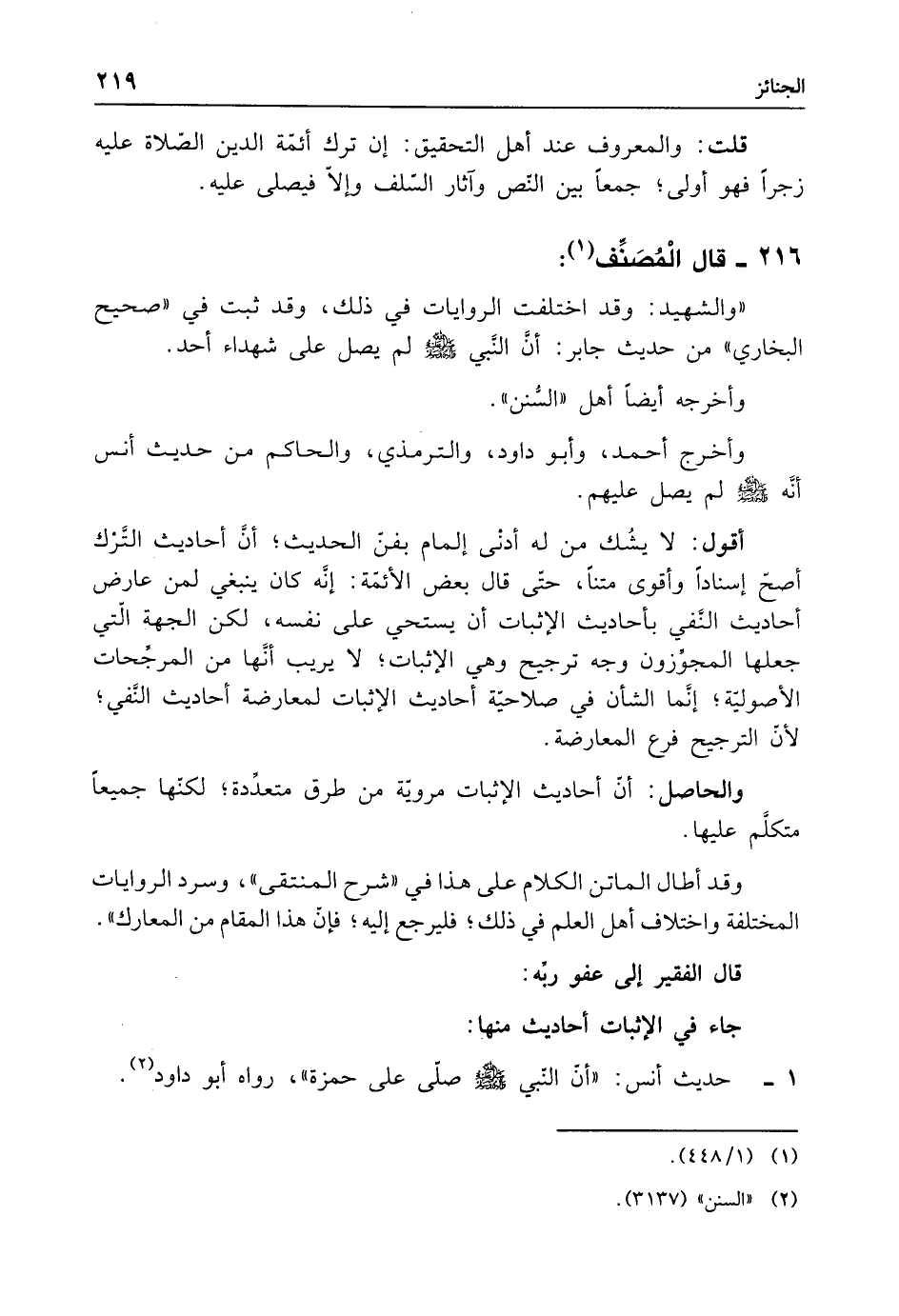 1 - حديث أنس: "أن النبي - صلى الله عليه وسلم - صلى على حمزة"، رواه أبو داود (¬2).