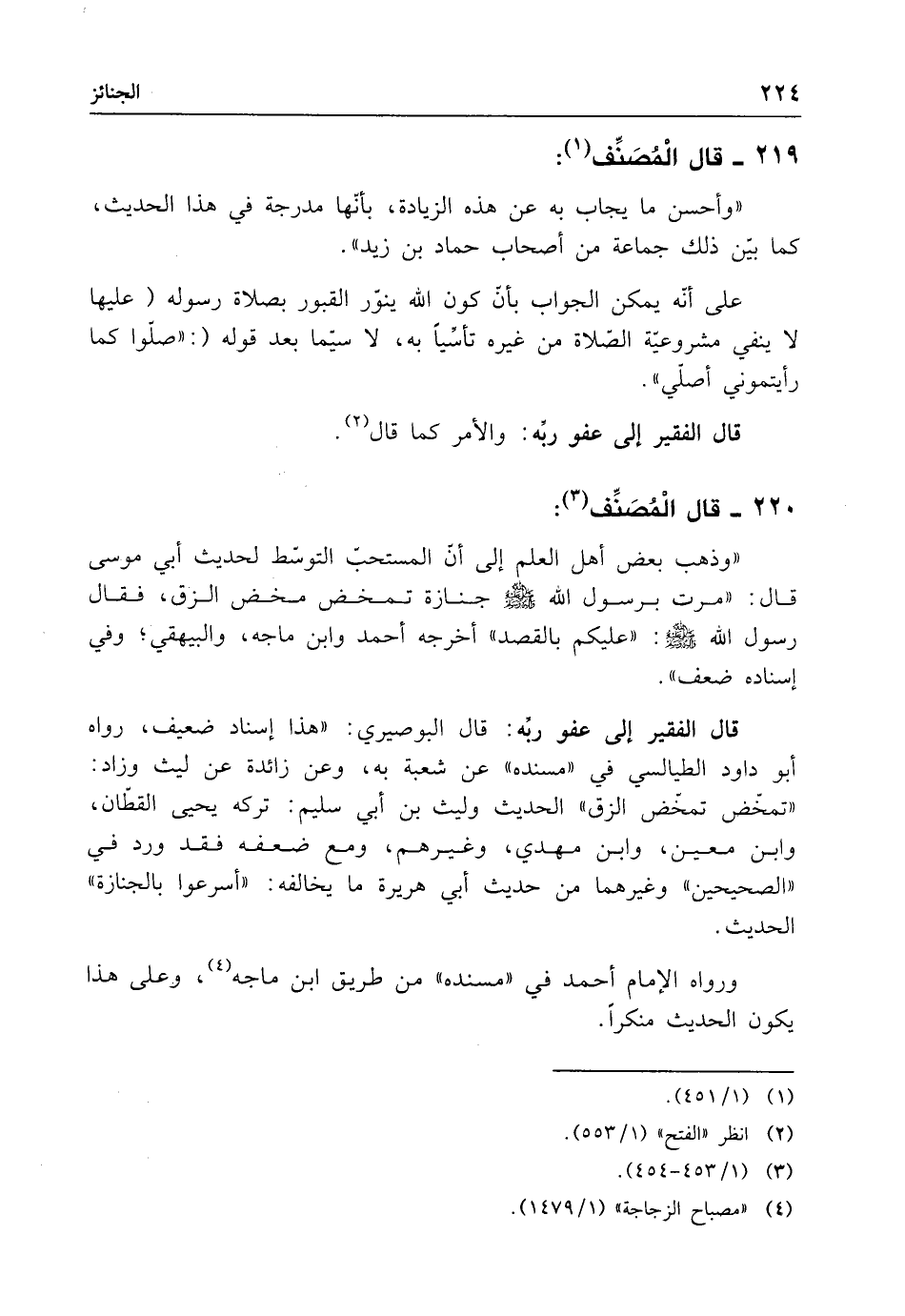 على أنه يمكن الجواب بأنَّ كون الله ينور القبور بصلاة رسوله (عليها لا ينفي مشروعيّة الصلاة من غيره تأسيًا به، لا سيما بعد قوله: ("صلّوا كما رأيتموني أصلي".