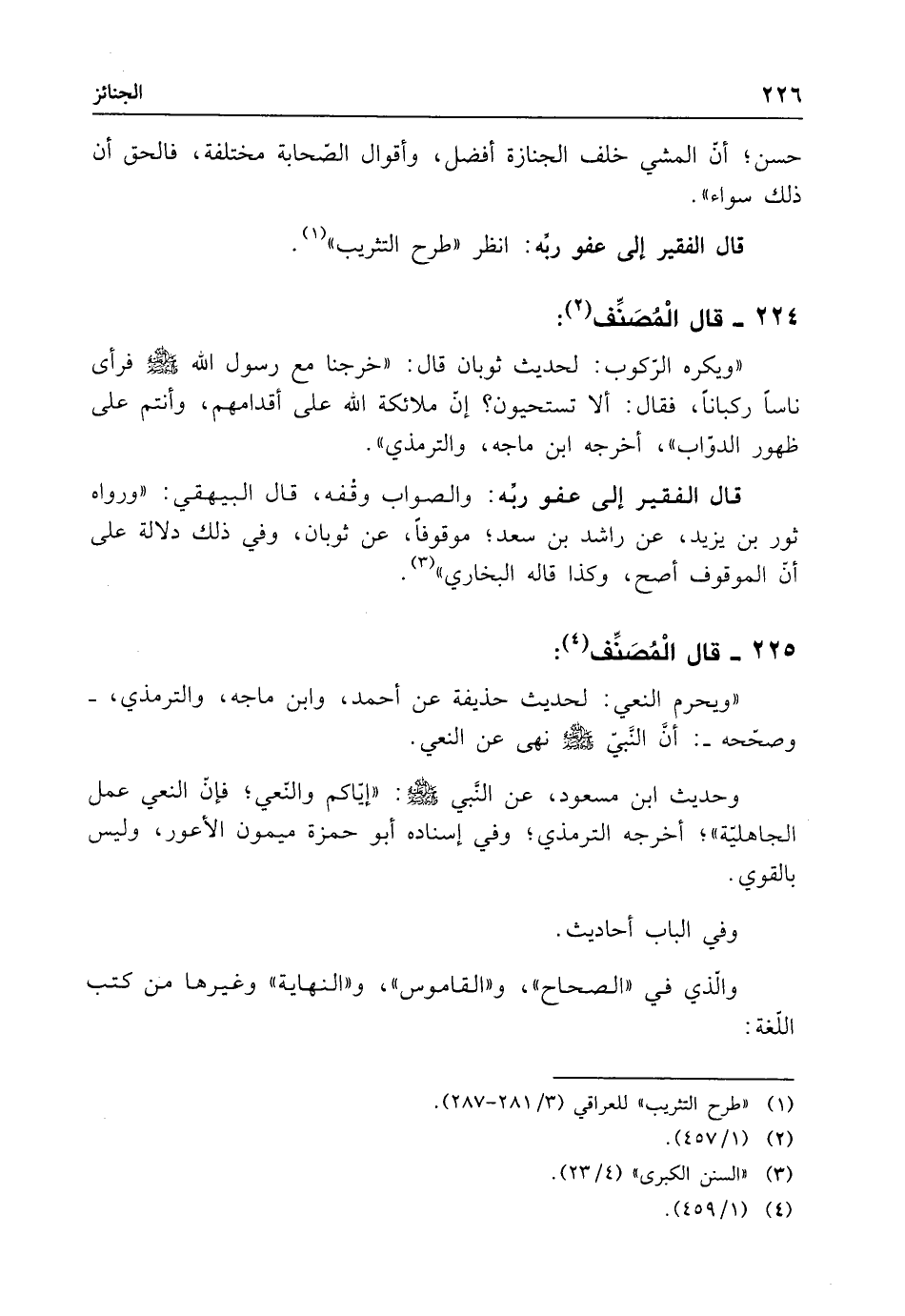 "ويحرم النعي: لحديث حذيفة عن أحمد، وابن ماجه، والترمذي، -وصححه-: أن النبي - صلى الله عليه وسلم - نهى عن النعي.