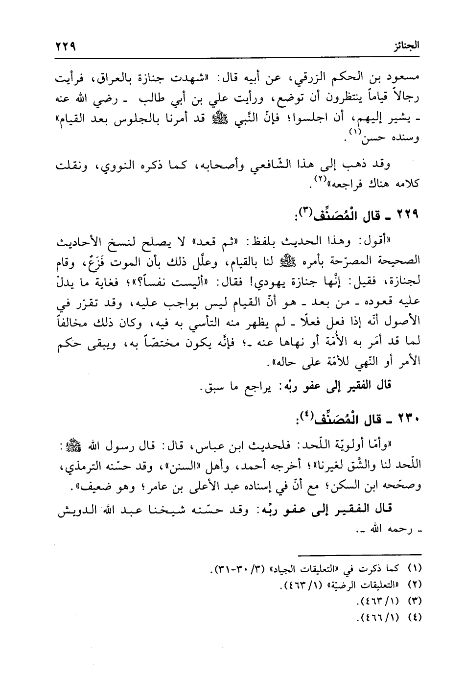 "أقول: وهذا الحديث بلفظ: "ثم قعد" لا يصلح لنسخ الأحاديث الصحيحة المصرحة بأمره - صلى الله عليه وسلم - لنا بالقيام، وعلل ذلك بأن الموت فَزَعٌ، وقام لجنازة، فقيل: إنها جنازة يهودي! فقال: "أليست نفسًا؟ "؛ فغاية ما يدلّ عليه قعوده -من بعد- هو أن القيام ليس بواجب عليه، وقد تقرر في الأصول أنه إذا فعل فعلًا -لم يظهر منه التأسي به فيه، وكان ذلك مخالفًا لما قد أمَر به الأُمة أو نهاها عنه-؛ فإنه يكون مختصًّا به، ويبقى حكم الأمر أو النهي للأمة على حاله".