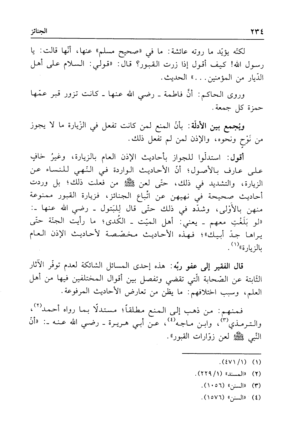 أقول: استدلوا للجواز بأحاديث الإذن العام بالزيارة، وغيرُ خافٍ على عارف بالأصول؛ أن الأحاديث الواردة في النهي للنساء عن الزيارة، والتشديد في ذلك، حتى - صلى الله عليه وسلم - من فعلت ذلك؛ بل وردت أحاديث صحيحة في نهيهن عن اتباع الجنائز، فزيارة القبور ممنوعة منهن بالأَوْلى، وشدد في ذلك حتى قال لِلبَتول - رضي الله عنها -: "لو بَلَغْتِ معهم -يعني: أهل الميّت- الكُدى؛ ما رأيت الجنّة حتّى يراها جدّ أبيك"؛ فهذه الأحاديث مخصّصة لأحاديث الإذن العام بالزيارة" (¬1).