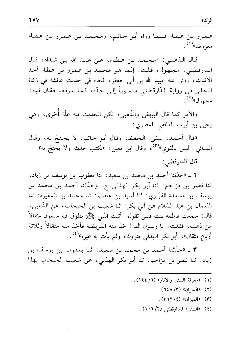 2 - "حدثنا أحمد بن محمد بن سعيد: ثنا يعقوب بن يوسف بن زياد: ثنا نصر بن مزاحم: ثنا أبو بكر الهذلي. ح. وحدثنا أحمد بن محمد بن يوسف بن مسعدة الفراري: ثنا أسيد بن عاصم: ثنا محمد بن المغيرة: ثنا النعمان بن عبد السلام عن أبي بكر: ثنا شعيب بن الحبحاب، عن الشعبي، قال: سمعت فاطمة بنت قيس تقول: أتيت النبي - صلى الله عليه وسلم - بطوق فيه سبعون مثقالًا من ذهب، فقلت: يا رسول الله! خذ منه الفريضة فأخذ منه مثقالًا وثلاثة أرباع مثقال"، أبو بكر الهذلي متروك، ولم يأت به غيره" (¬4).