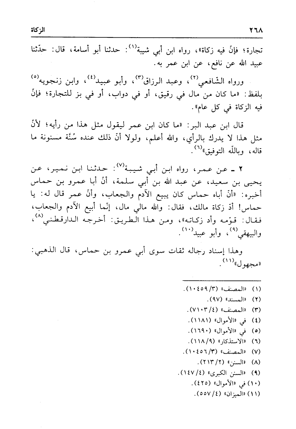 2 - عن عمر، رواه ابن أبي شيبة (¬7): حدثنا ابن نمير، عن يحيى بن سعيد، عن عبد الله بن أبي سلمة، أن أبا عمرو بن حماس أخبره: "أن أباه حماس كان يبيع الآدم والجعاب، وأن عمر قال له: يا حماس! أدّ زكاة مالك، فقال: والله مالي مال، إنما أبيع الآدم والجعاب، فقال: قوّمه وأد زكاته"، ومن هذا الطريق: أخرجه الدارقطني (¬8)، والبيهقي (¬9)، وأبو عبيد (¬10).