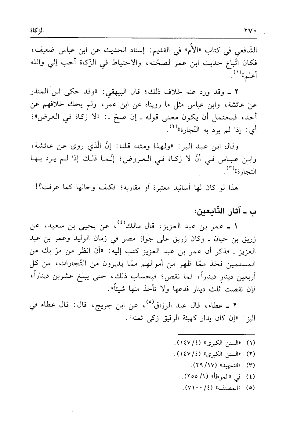 وقال ابن عبد البر: "ولهذا ومثله قلنا: إن الذي روى عن عائشة، وابن عباس في أن لا زكاة في العروض، إنما ذلك إذا لم يرد بها التجارة" (¬3).