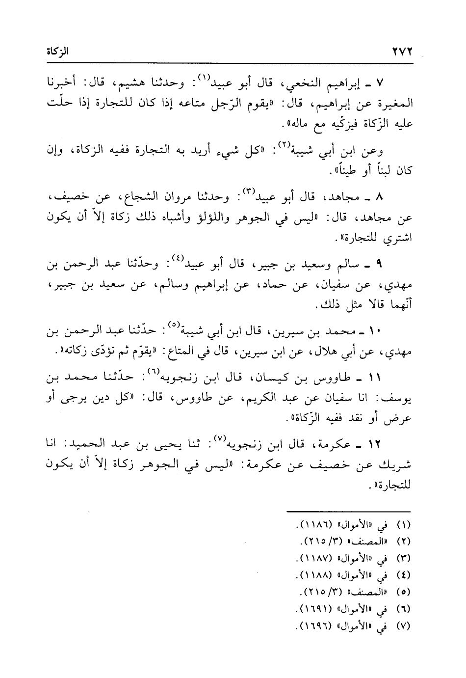 12 - عكرمة، قال ابن زنجويه (¬7): ثنا يحيى بن عبد الحميد: انا شريك عن خصيف عن عكرمة: "ليس في الجوهر زكاة إلّا أن يكون للتجارة".