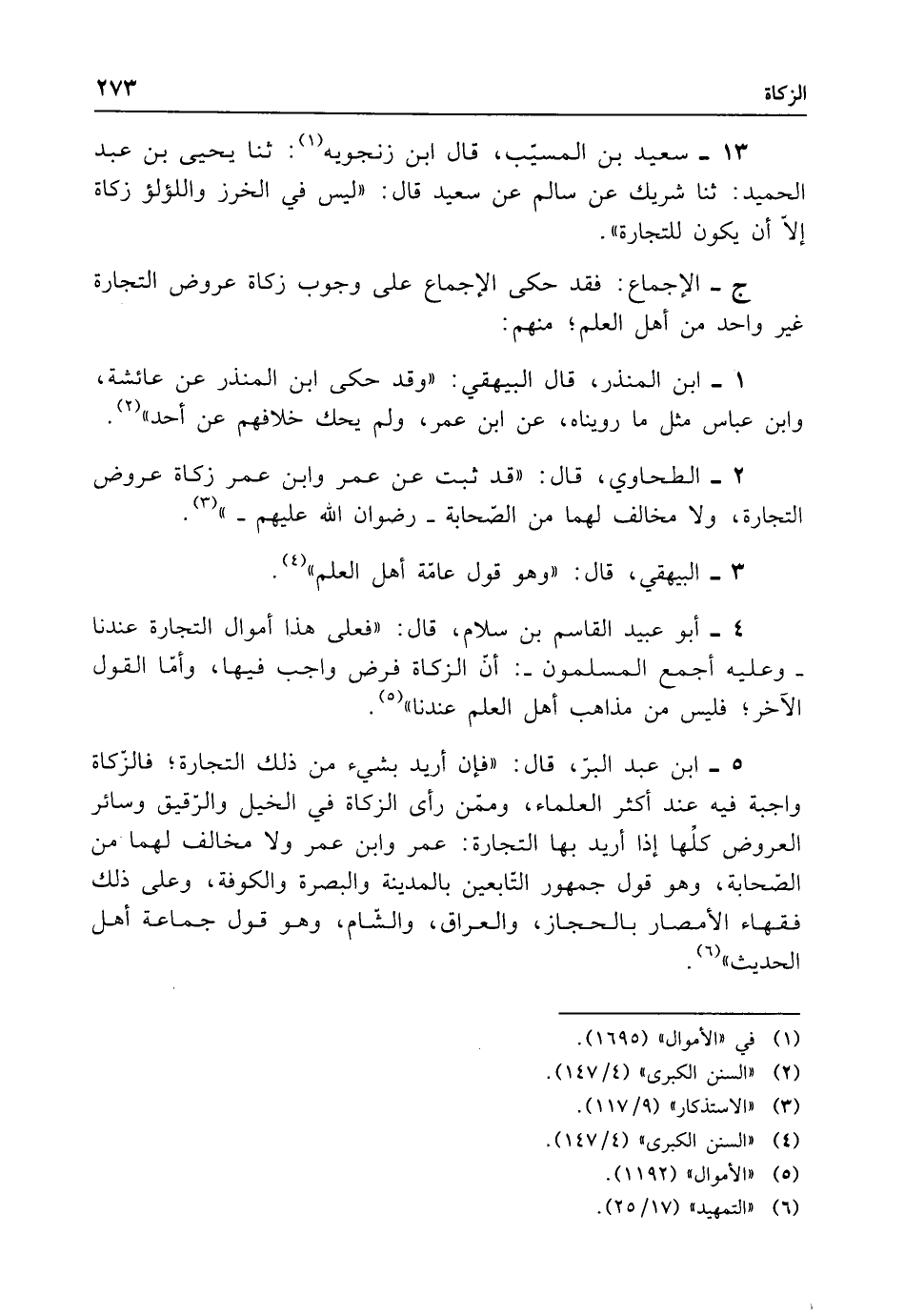 5 - ابن عبد البر، قال: "فإن أريد بشيء من ذلك التجارة؛ فالزّكاة واجبة فيه عند أكثر العلماء، وممن رأى الزكاة في الخيل والرقيق وسائر العروض كلها إذا أريد بها التجارة: عمر وابن عمر ولا مخالف لهما من الصّحابة، وهو قول جمهور التابعين بالمدينة والبصرة والكوفة، وعلى ذلك فقهاء الأمصار بالحجاز، والعراق، والشام، وهو قول جماعة أهل الحديث" (¬6).