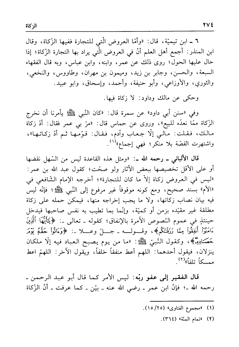 قال الألباني -رحمه الله-: "ومثل هذه القاعدة ليس من السهل نقضها أو على الأقل تخصيصها ببعض الآثار ولو صحت؛ كقول عبد الله بن عمر: "ليس في العروض زكاة إلَّا ما كان للتجارة"؛ أخرجه الإمام الشافعي في "الأم" بسند صحيح، ومع كونه موقوفًا غير مرفوع إلى النبي - صلى الله عليه وسلم -؛ فإنه ليس فيه بيان نصاب زكاتها، ولا ما يجب إخراجه منها، فيمكن حمله على زكاة مطلقة غير مقيده بزمن أو كمية، وإنما بما تطيب به نفس صاحبها فيدخل حينئذ في عموم النصوص الآمرة بالإتفاق؛ كقوله -تعالى-: {يَا أَيُّهَا الَّذِينَ آمَنُوا أَنْفِقُوا مِمَّا رَزَقْنَاكُمْ}، وقوله -جل وعلا-: {وَآتُوا حَقَّهُ يَوْمَ حَصَادِهِ}، وكقول النبي - صلى الله عليه وسلم -: "ما من يوم يصبح العباد فيه إلا ملكان ينزلان، فيقول أحدهما: اللهم أعط منفقًا خلفًا، ويقول الآخر: اللهم اعط ممسكًا تلفًا" (¬2).