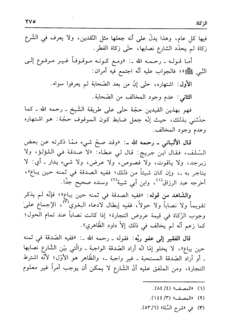 قال الألباني -رحمه الله-: "وقد صح شيء مما ذكرته عن بعض السلف، فقال ابن جريج: قال لي عطاء: "لا صدقة في اللؤلؤ، ولا زبرجد، ولا ياقوت، ولا فصوص، ولا عرض، ولا شيء يدار -أي: لا يتاجر به-، وإن كان شيئًا من ذلك؛ ففيه الصدقة في ثمنه حين يباع"، أخرجه عبد الرزاق (¬1)، وابن أبي شيبة (¬2) وسنده صحيح جدًّا.