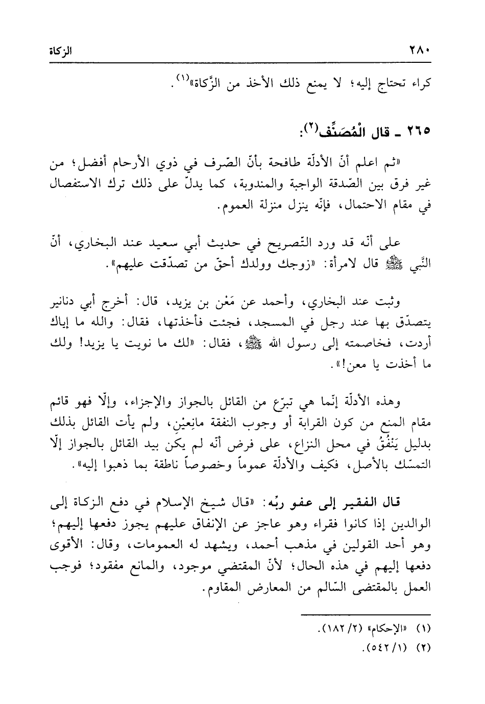 "ثم اعلم أنّ الأدلة طافحة بأن الصرف في ذوي الأرحام أفضل؛ من غير فرق بين الصدقة الواجبة والمندوبة، كما يدل على ذلك ترك الاستفصال في مقام الاحتمال، فإنّه ينزل منزلة العموم.
