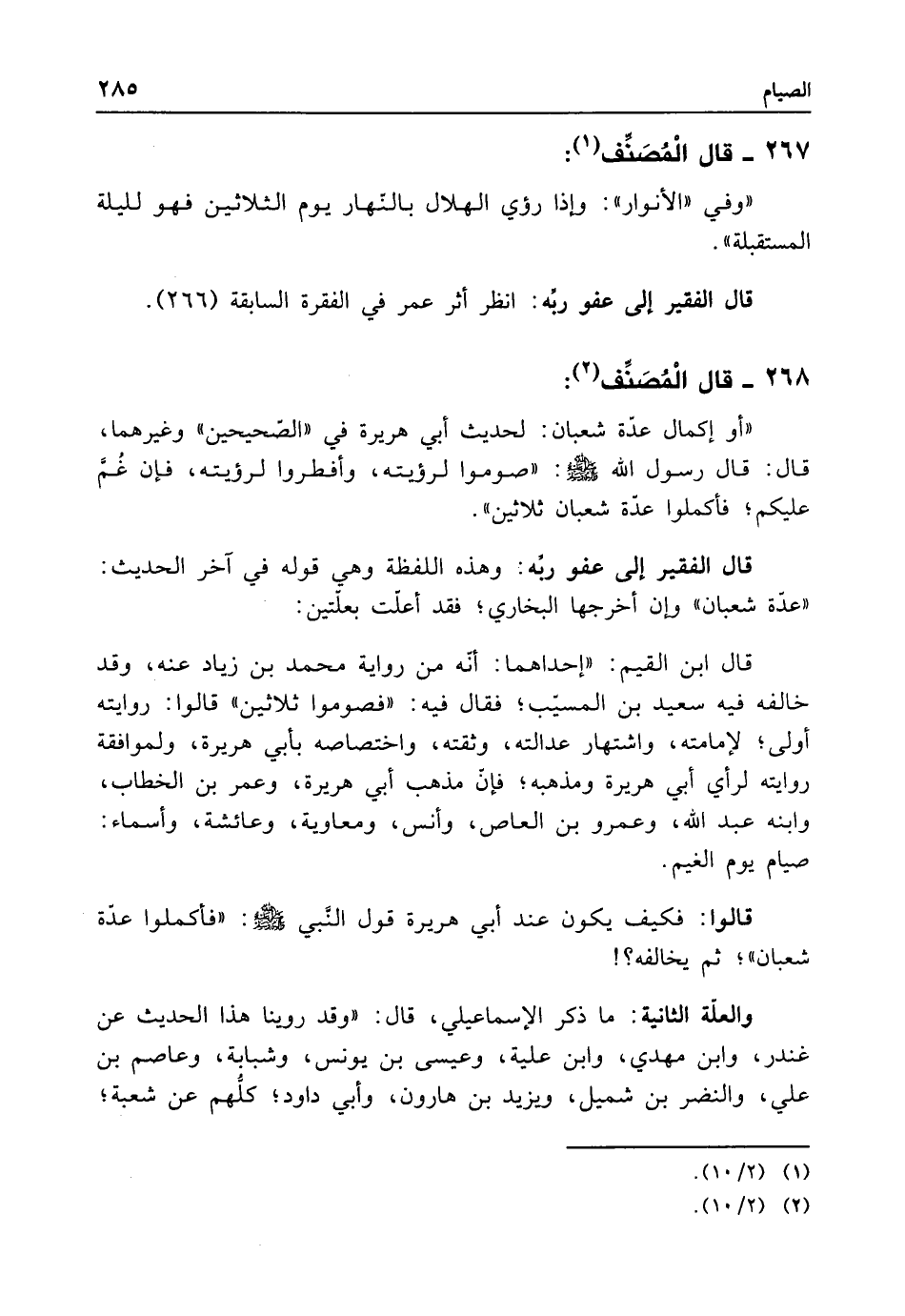 "أو إكمال عدّة شعبان: لحديث أبي هريرة في "الصّحيحين" وغيرهما، قال: قال رسول الله - صلى الله عليه وسلم -: "صوموا لرؤيته، وأفطروا لرؤيته، فإن غُمَّ عليكم؛ فأكملوا عدّة شعبان ثلاثين".