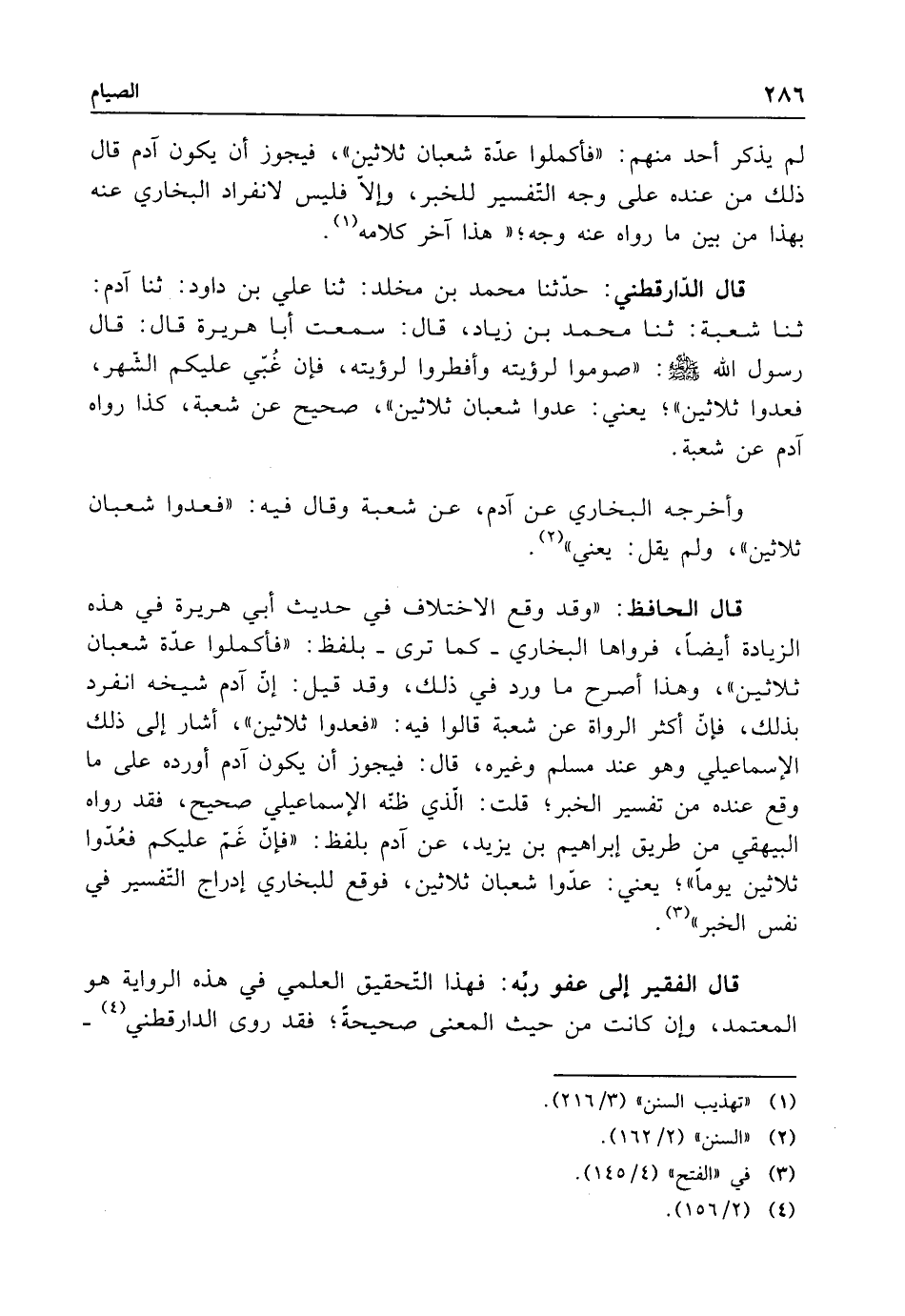 قال الحافظ: "وقد وقع الاختلاف في حديث أبي هريرة في هذه الزيادة أيضًا، فرواها البخاري -كما ترى- بلفظ: "فأكملوا عدّة شعبان ثلاثين"، وهذا أصرح ما ورد في ذلك، وقد قيل: إن آدم شيخه انفرد بذلك، فإن أكثر الرواة عن شعبة قالوا فيه: "فعدوا ثلاثين"، أشار إلى ذلك الإسماعيلي وهو عند مسلم وغيره، قال: فيجوز أن يكون آدم أورده على ما وقع عنده من تفسير الخبر؛ قلت: الذي ظنه الإسماعيلي صحيح، فقد رواه البيهقي من طريق إبراهيم بن يزيد، عن آدم بلفظ: "فإن غَم عليكم فعُدّوا ثلاثين يومًا"، يعني: عدّوا شعبان ثلاثين، فوقع للبخاري إدراج التفسير في نفس الخبر" (¬3).